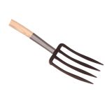 Lakeret asketræsskaft med kraftigt jern D-greb. Grebhoved 270x170 mm, totallængde 1200 mm, vægt 2050 g.