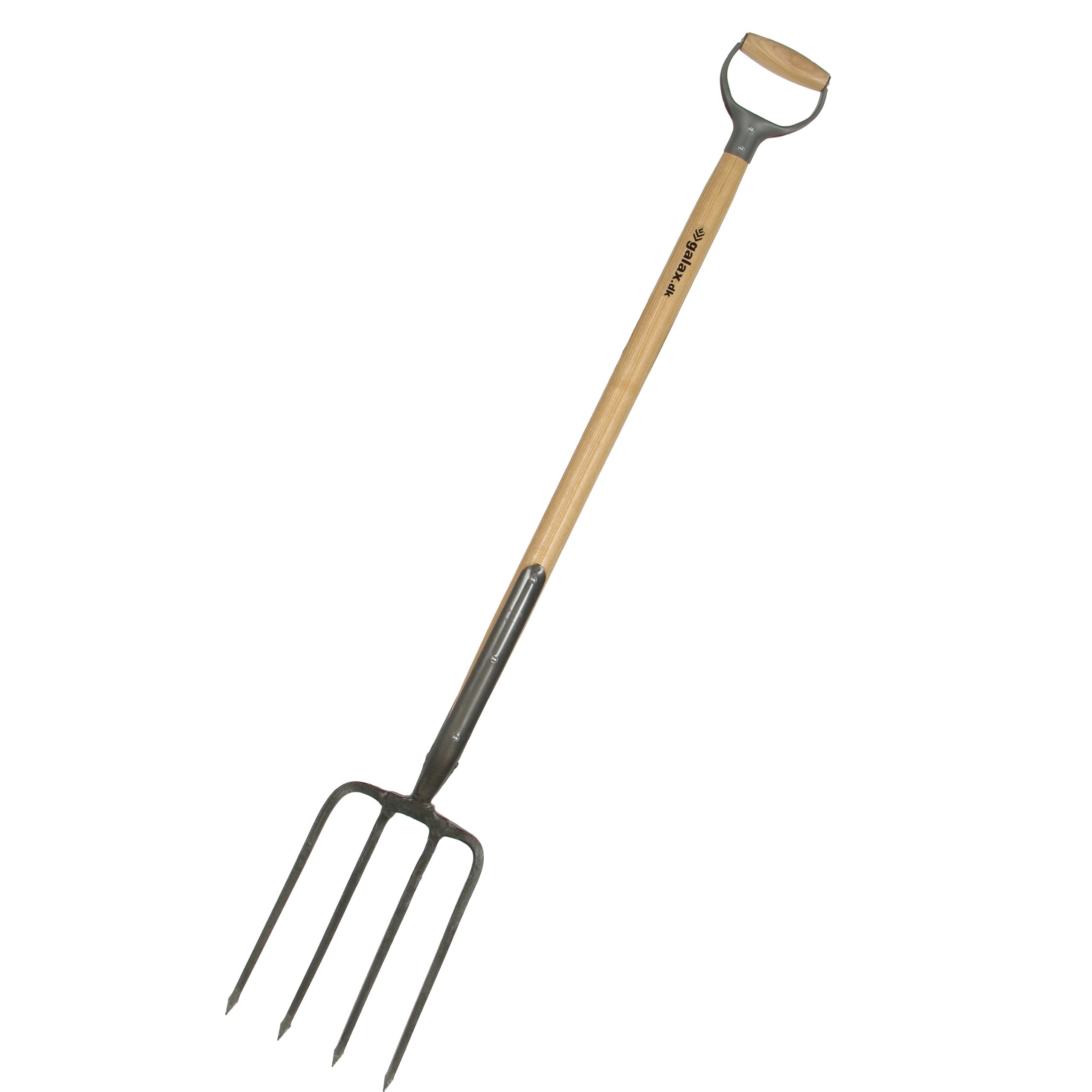 Lakeret asketræsskaft med kraftigt jern D-greb. Grebhoved 310x200 mm, totallængde 1240 mm, vægt 2830 g.|