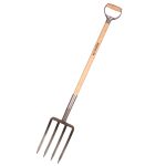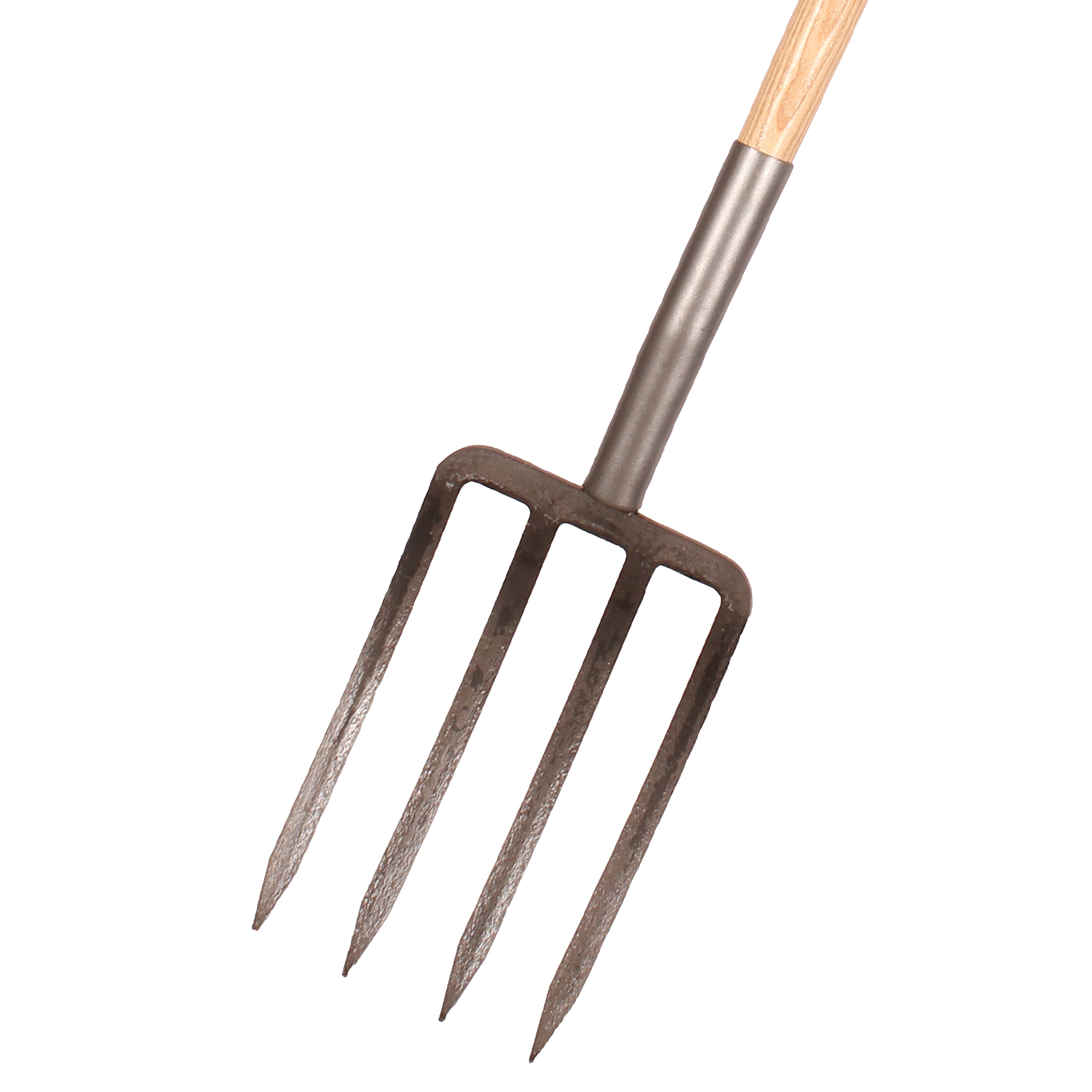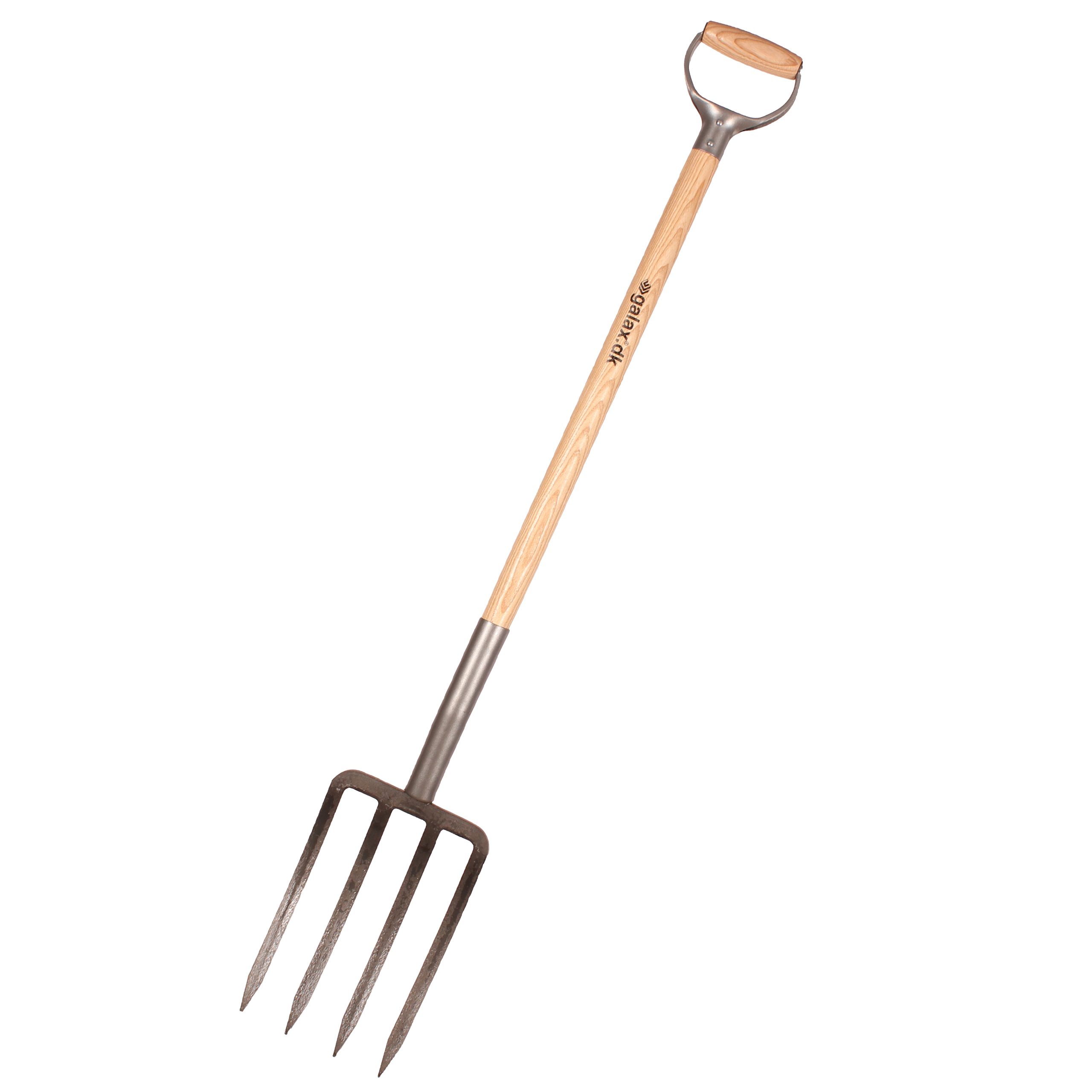 Lakeret asketræsskaft med kraftigt jern D-greb. Grebhoved 310x190 mm, totallængde 1160 mm, vægt 2200 g.