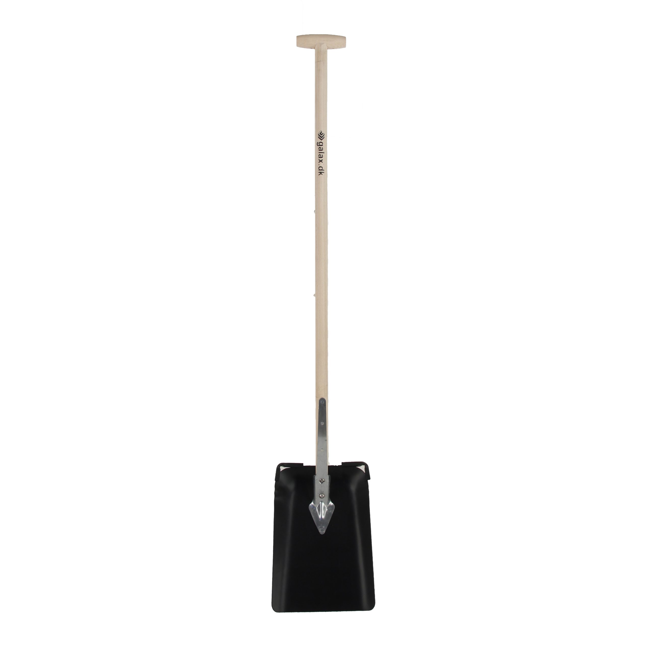 Asketræsskaft med krykke. Hærdet og pulverlakeret skovlblad med firkantet tråd, der går ud over begge sider. Skovlblad 320x230 mm, totallængde 1280 mm, vægt 2050 g.