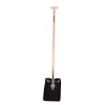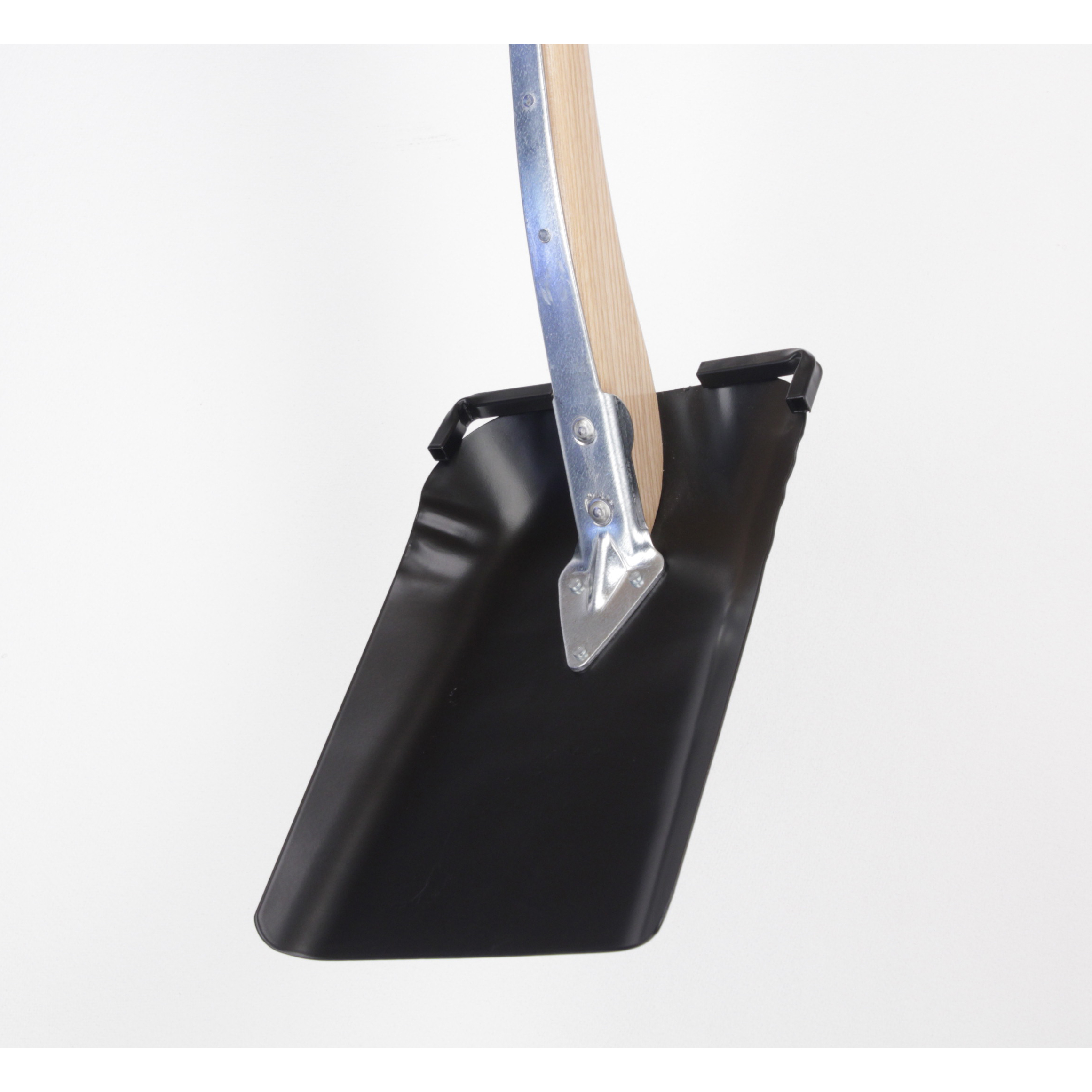 Kvalitetsskovl med lakeret asketræsskaft med krykke.. Hærdet og pulverlakeret skovlblad med firkantet tråd, der går ud over begge sider. Skovlblad 320x230 mm, totallængde 1300 mm, vægt 2050 g.