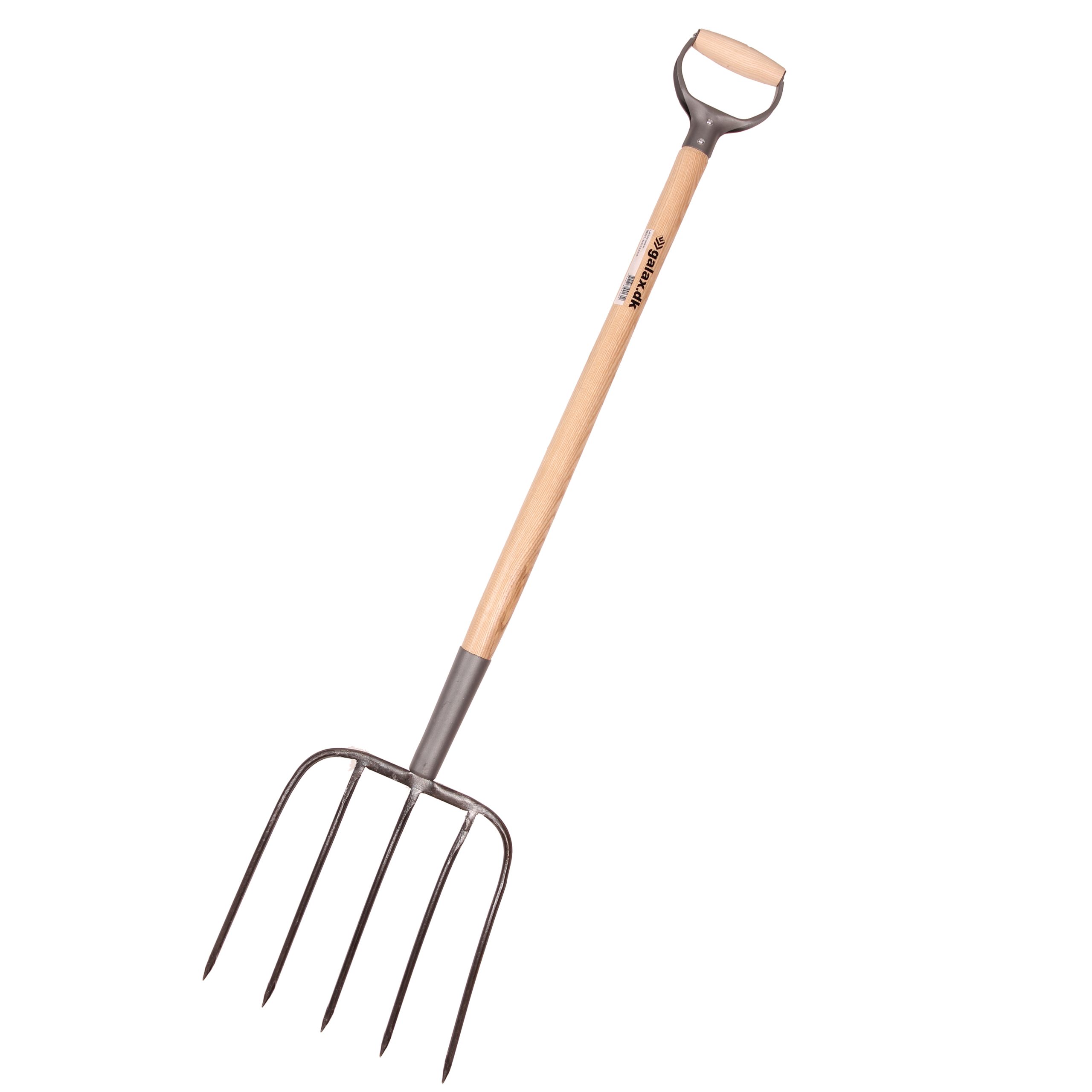 Lakeret asketræsskaft med kraftigt jern D-greb. Grebhoved 300x300 mm, totallængde 1200 mm, vægt 2450 g.