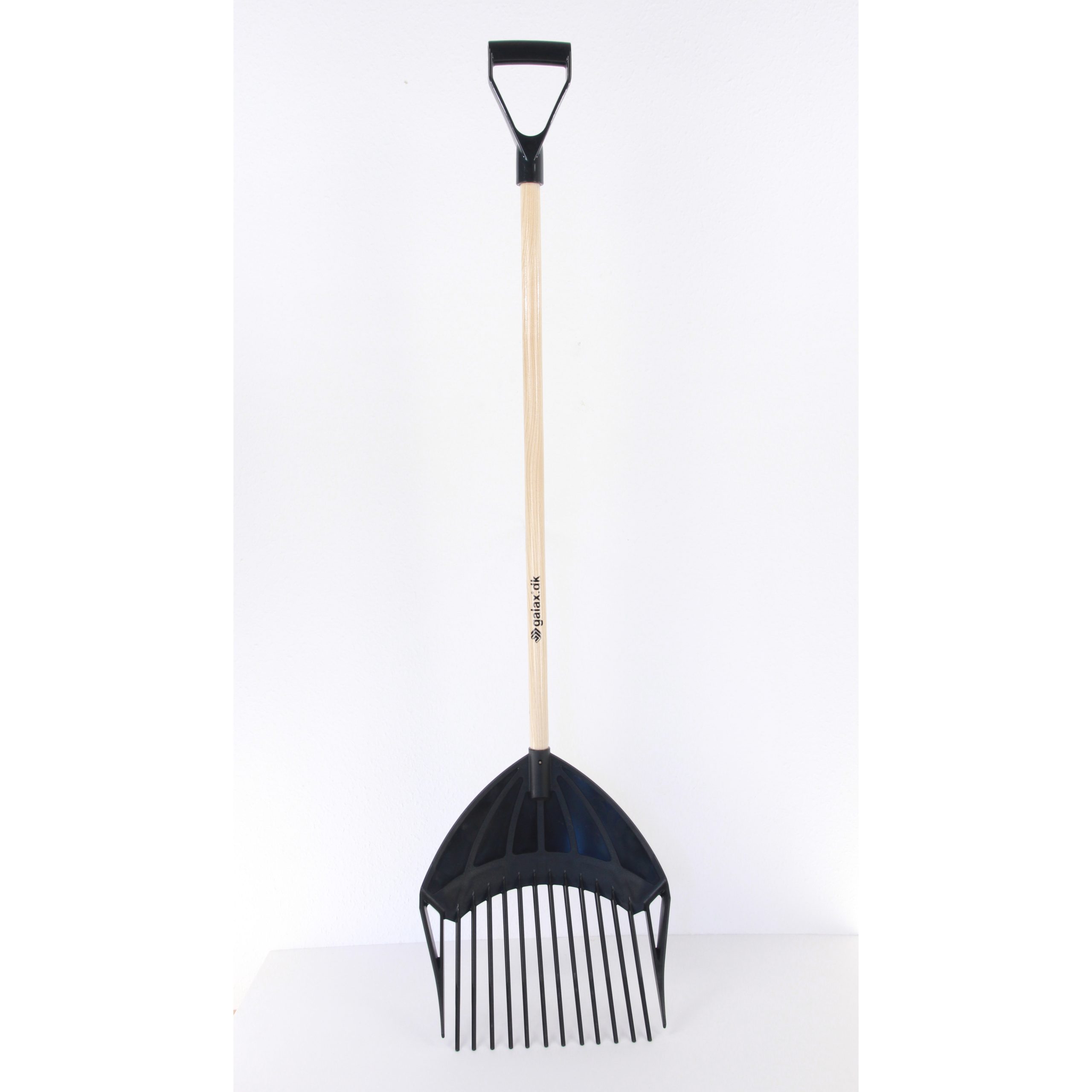 14-grenet plastgreb med lakeret asketræsskaft og plast D-greb. Bladmål: bredde 370 mm, højde 410 mm, totallængde 1400mm. 2 cm mellem tænderne